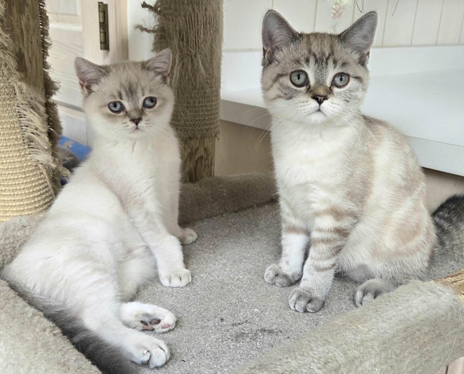 ANAIS and BAYLEN are 4 month old BRITISH SHORTHAIR siblings, both have light blue eyes. Anais has a BLUE POINT coat and Baylen has a MARBLED TABBY coat. He is a combination of stripes and swirls. Gorgeous! Anais also has a lazy left eye (strabismus), which on some days, is lazier than others. Lol Nothing to be done about it, and causes no problems, as it is genetic. It just makes her more endearing.