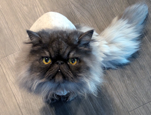 BERGIE is a precious BLACK AND GRAY PERSIAN with big amber eyes. He is approximately 5 years old, is neutered, front-paw declawed, is up to date on vaccinations, tested negative for FeLV/FIV, and is microchipped. He weighs close to 12 lbs.