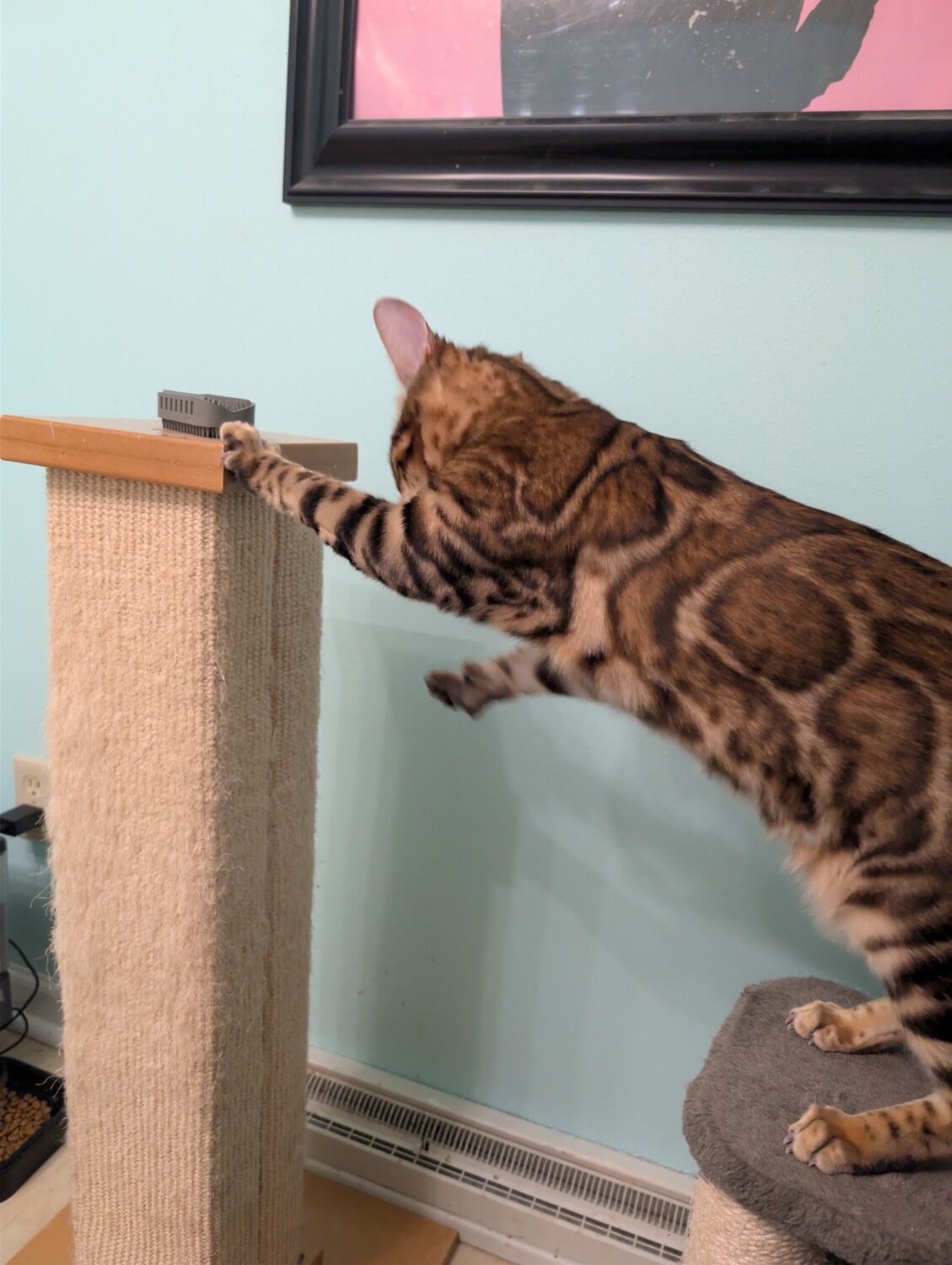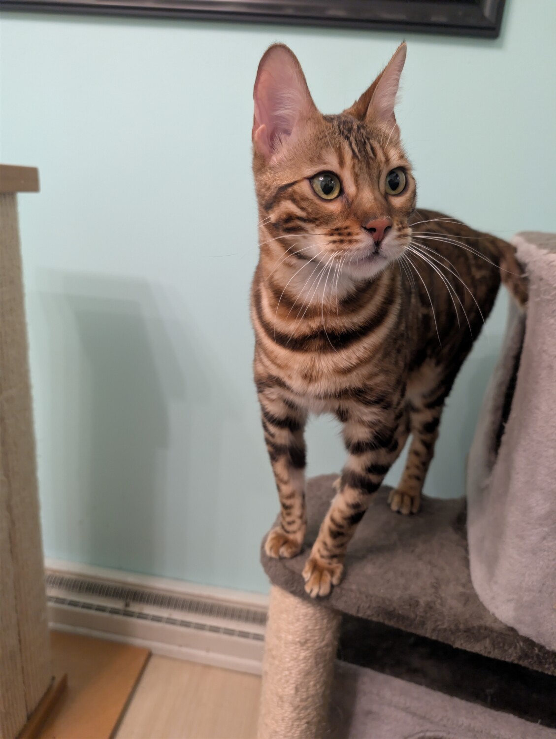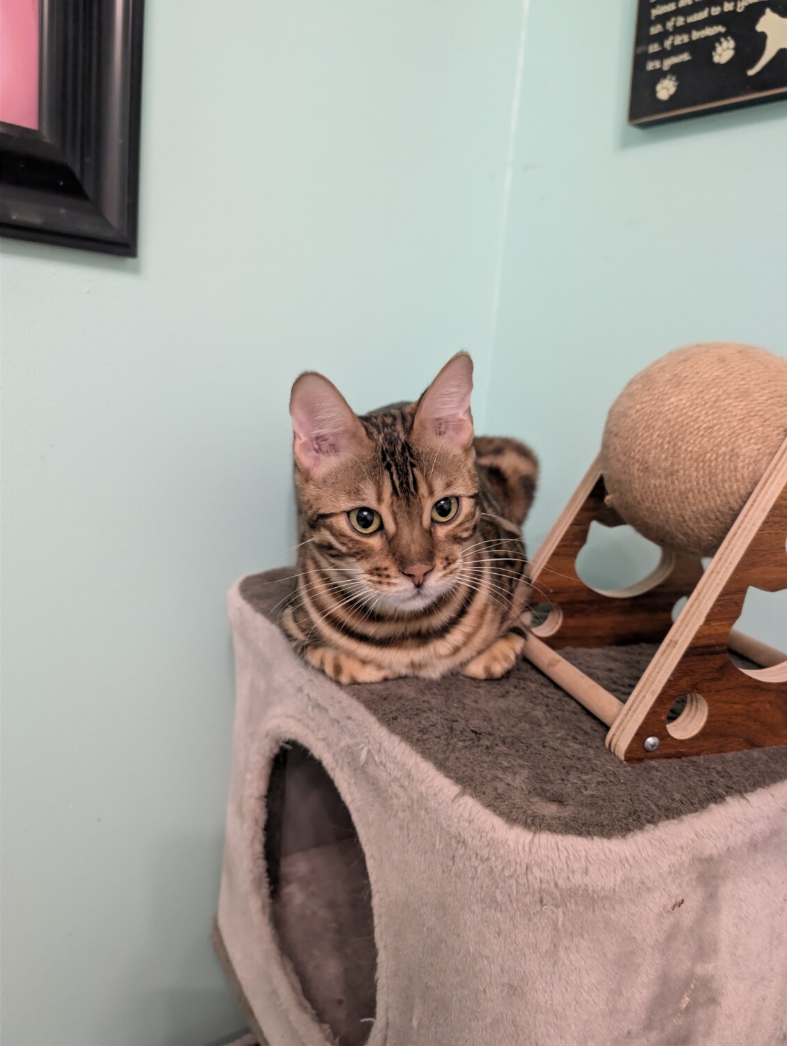 Bongo is a stunning 1‑year‑old brown‑spotted Bengal with a heart every bit as beautiful as his coat. Unlike many Bengals, he has a sweet, quiet demeanor and the softest little meow—more of a polite whisper than a demand for attention. He’s a sensitive soul who blossoms in calm, predictable environments and would do best in a quieter home without young children.