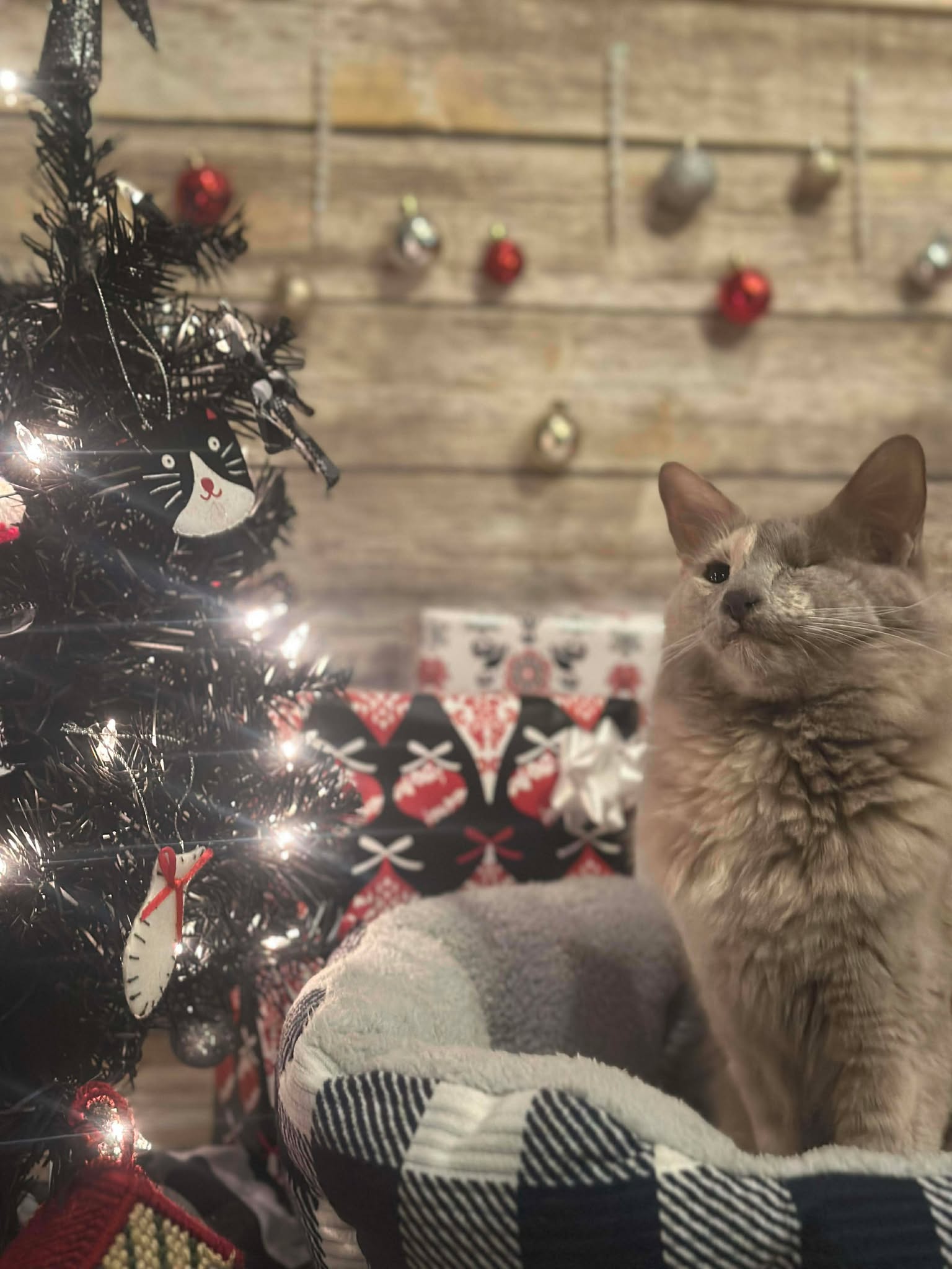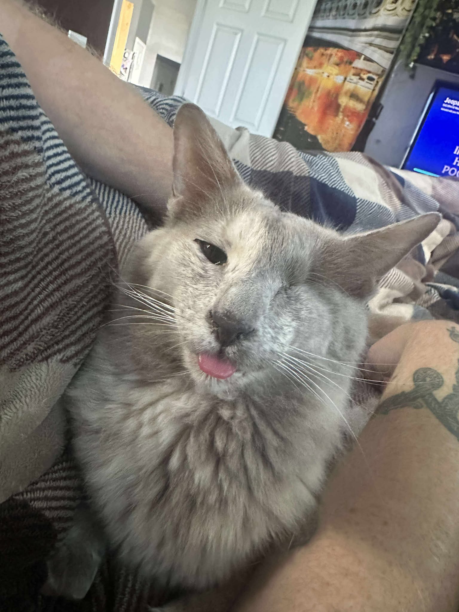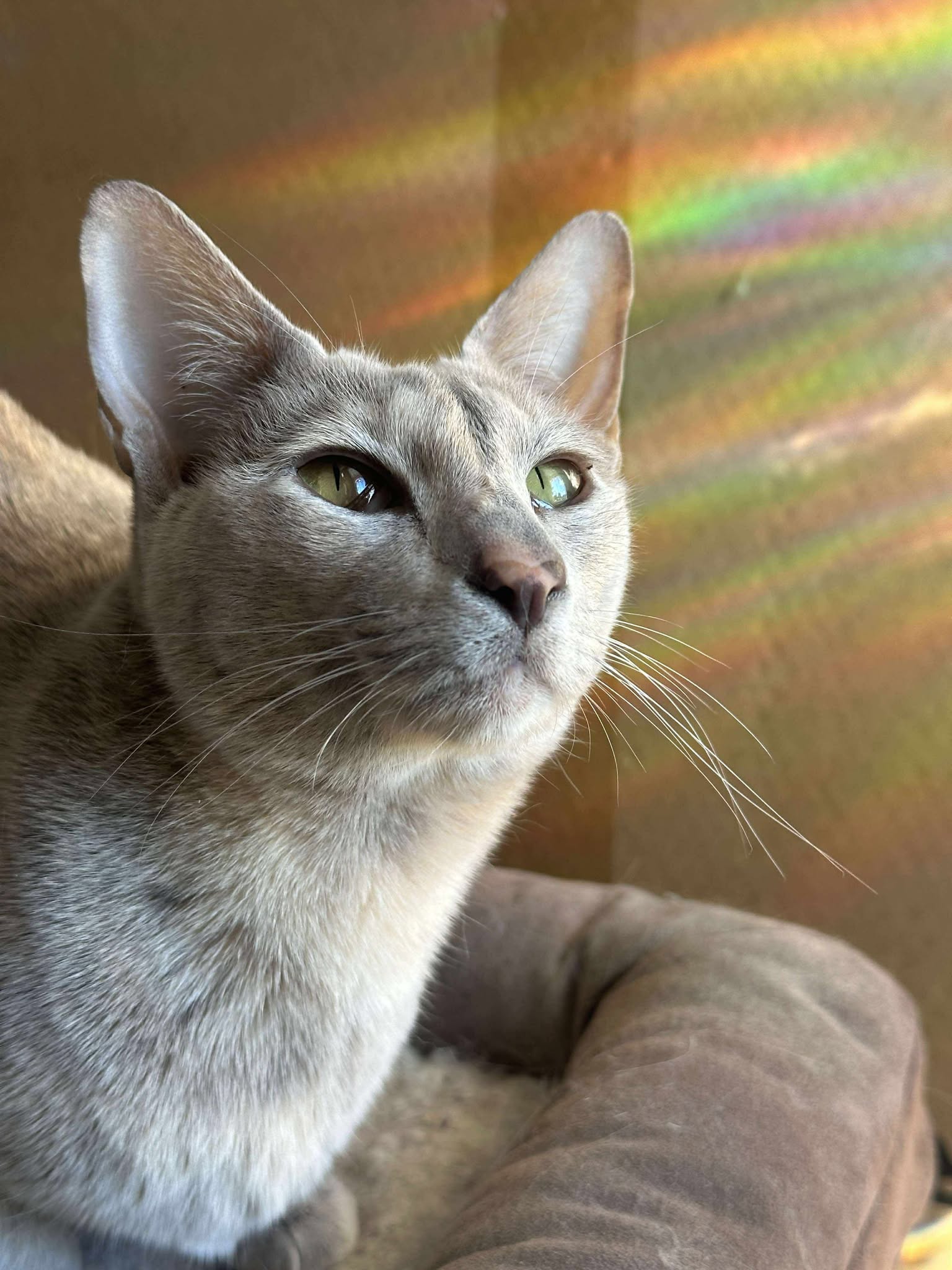 Cinnamon approximately 5 years old and is an easy going gal who enjoys spending her days relaxing and lounging about. Unfortunately this gal has had some dental issues and has very few teeth left now. But that doesn’t stop her from enjoying her favorite dry food. She also has some chronic sinus issues but is managed with an allergy medicine. She easily gobbles it right up it if put in churu.