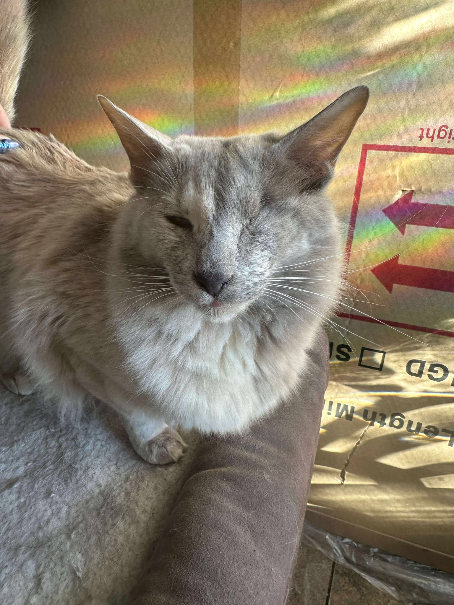 Some of their favorite activities are lounging in their cat beds, watching birds from their cat tree and shredding cardboard. Toys are also sometimes fun. Busy households with kids, dogs and lots of visitors would be too much for them. But a calm, quieter home with other mellow cats should be fine as long as proper introductions were done. They are looking for a very special home. Would that possibly be yours?