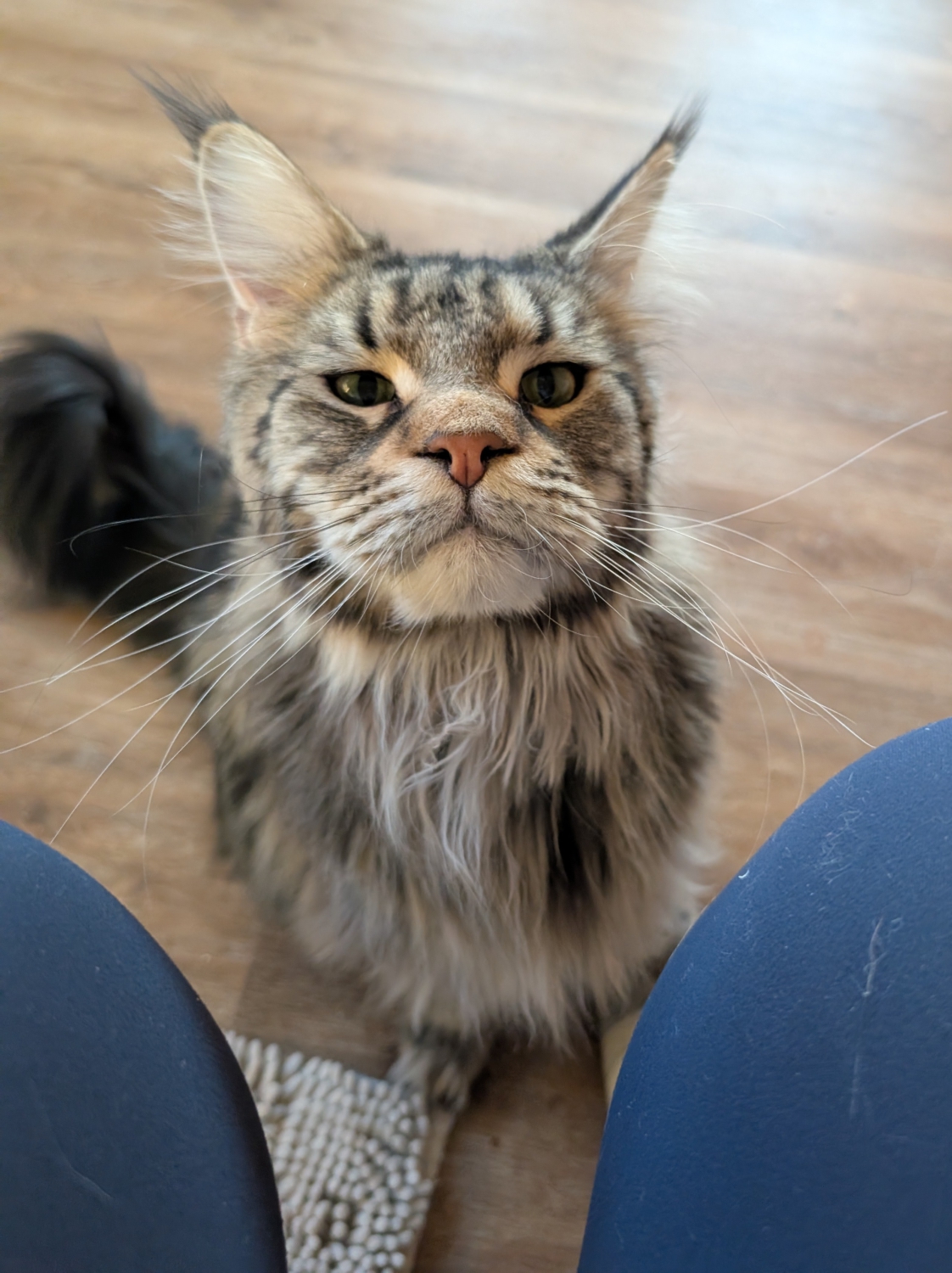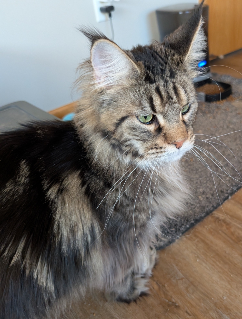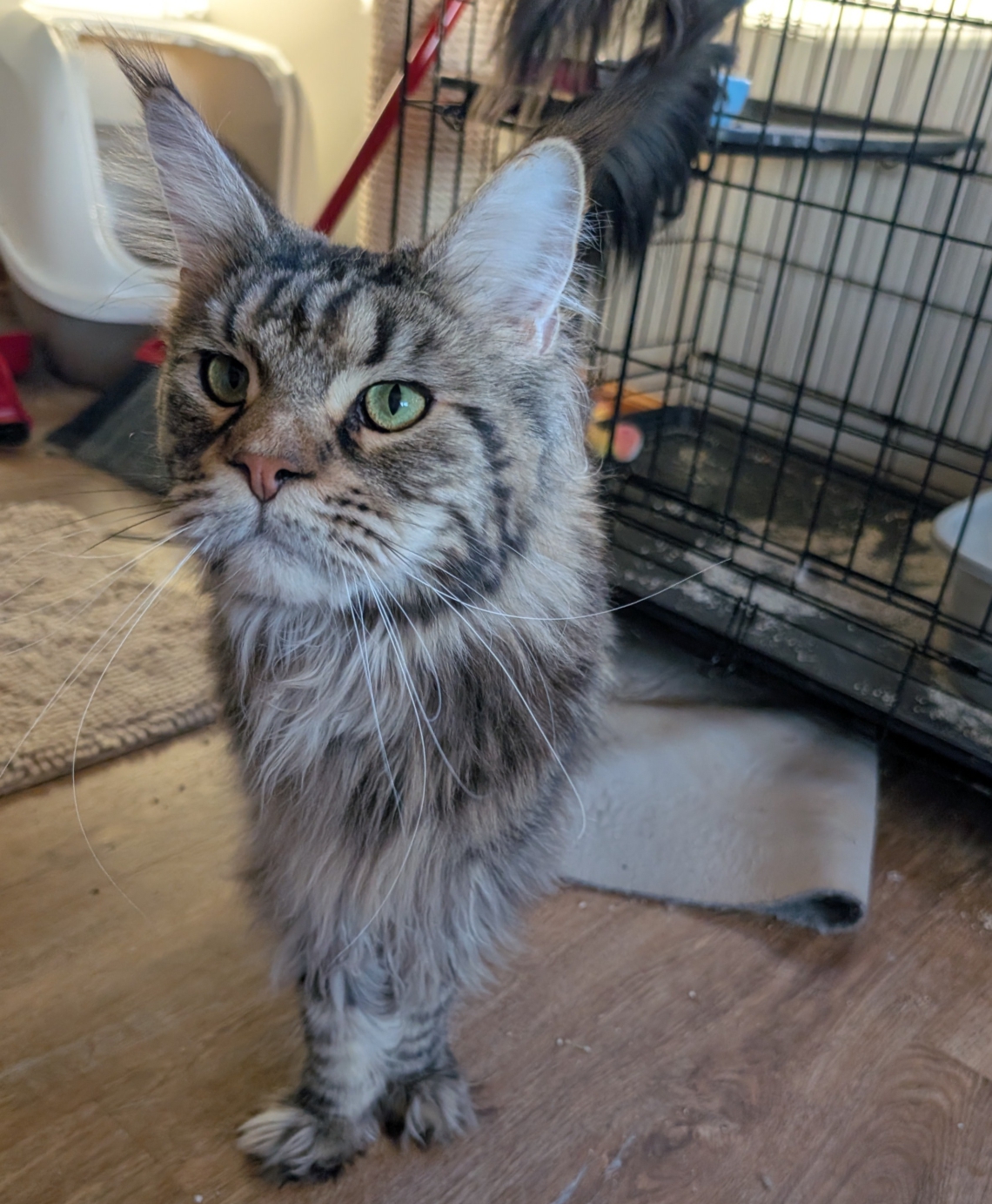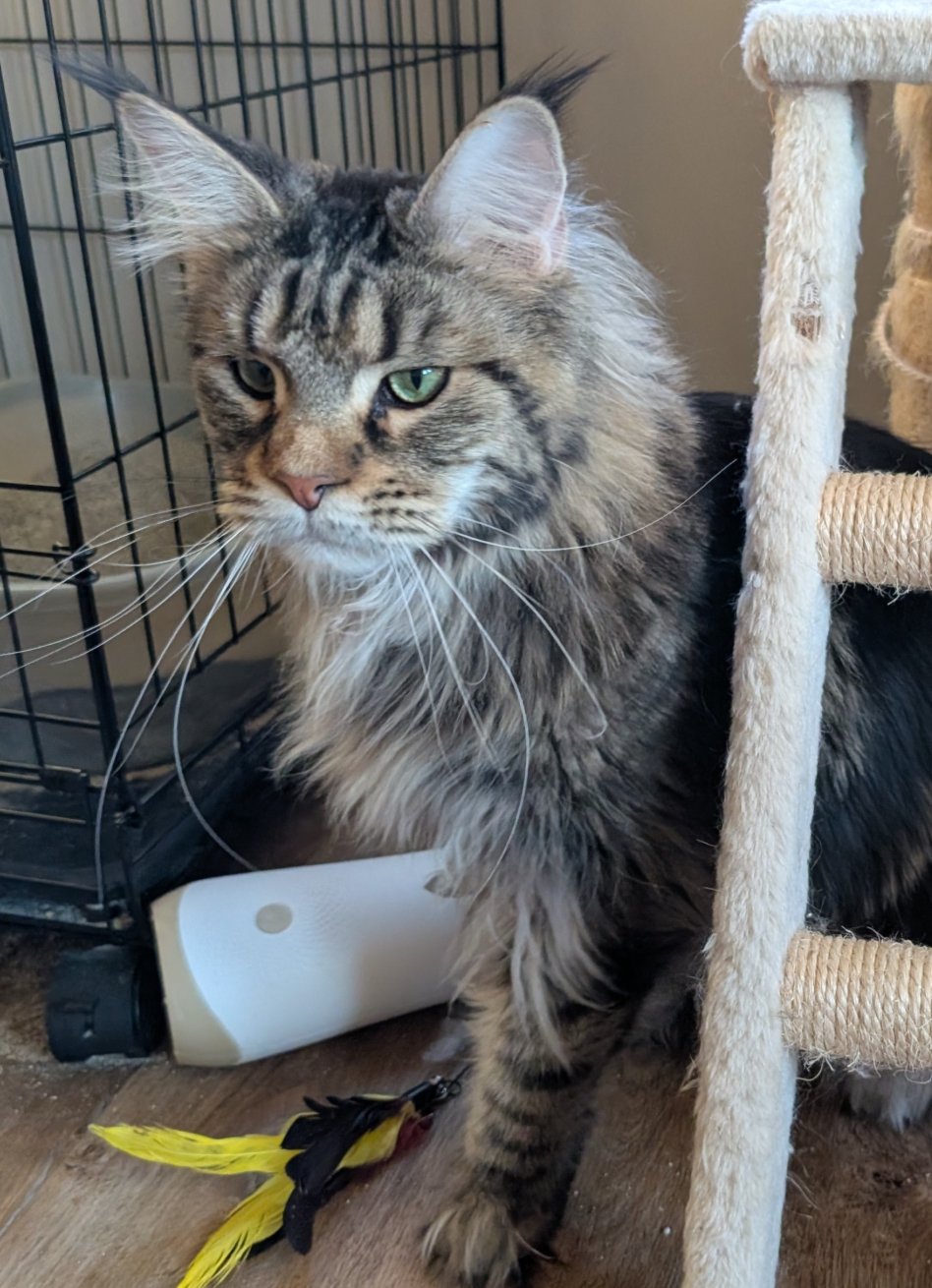 Cyrus is very vocal like most Maine Coons. He loves to play with all manner of toys. He does not like his carrier and gets anxious on any trips. He also does not like to be brushed(the undercarriage), although we have been working on that. He does not like to be carried, but will tolerate being picked up. He will need to go to a home with no alpha kitty- quiet laid back cats should be fine. Dogs that ignore him would probably be fine, no small children-older respectful children would be ok. His preferred home, would have some experience with large, long haired cats.