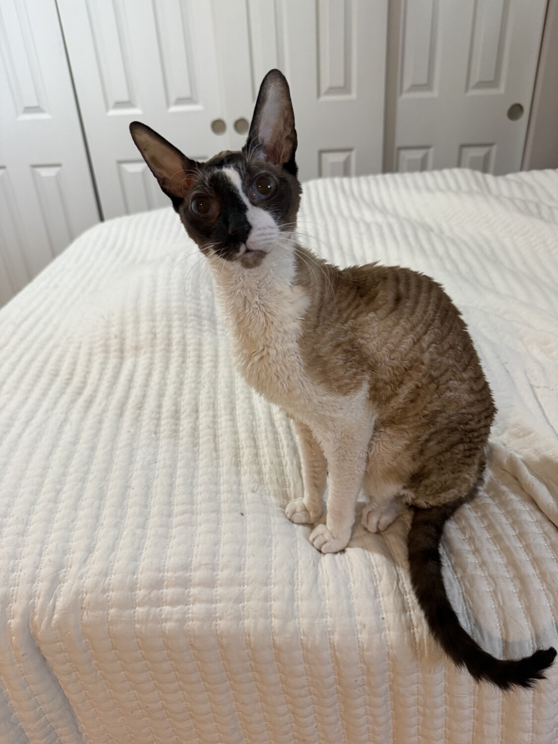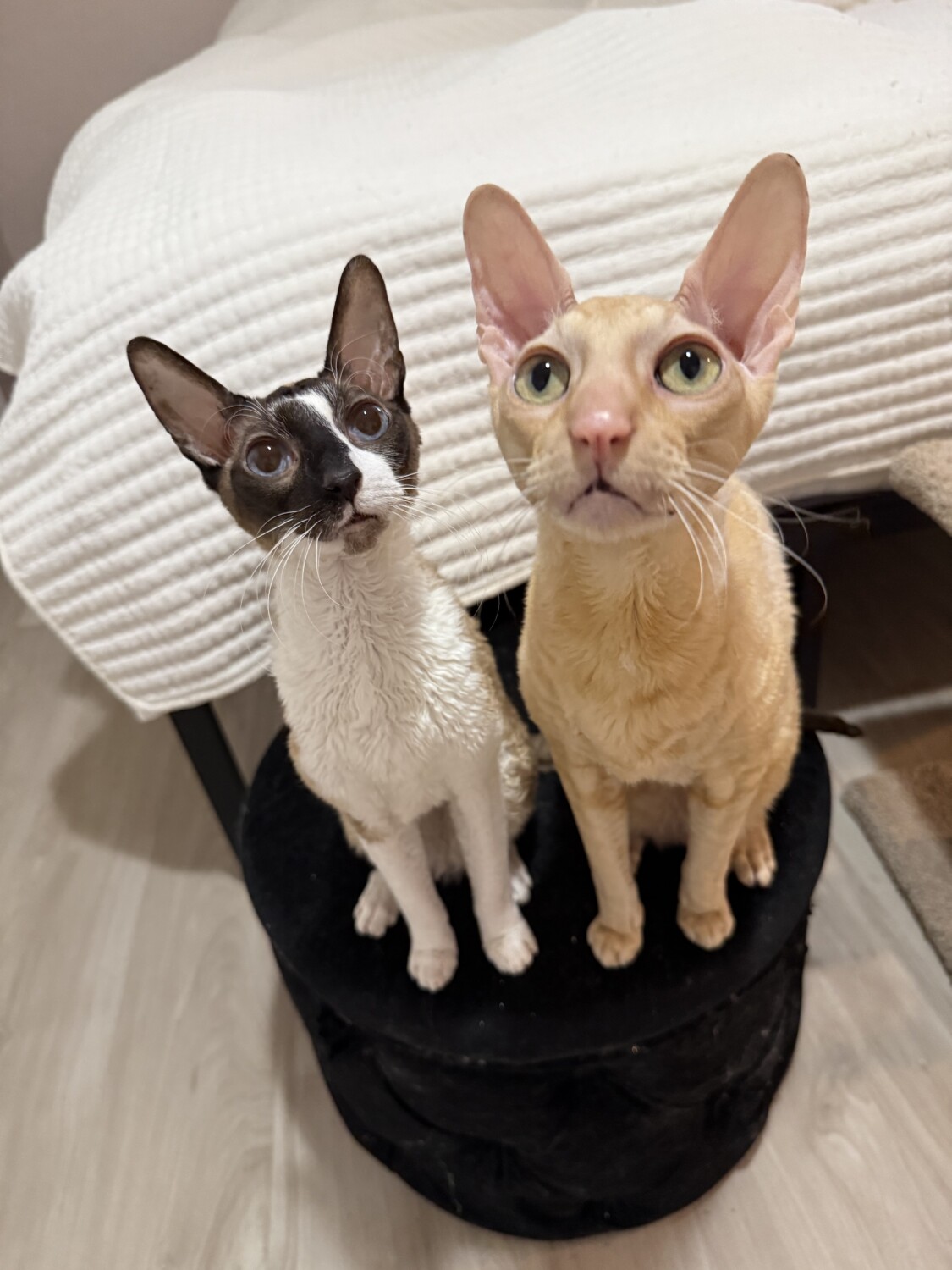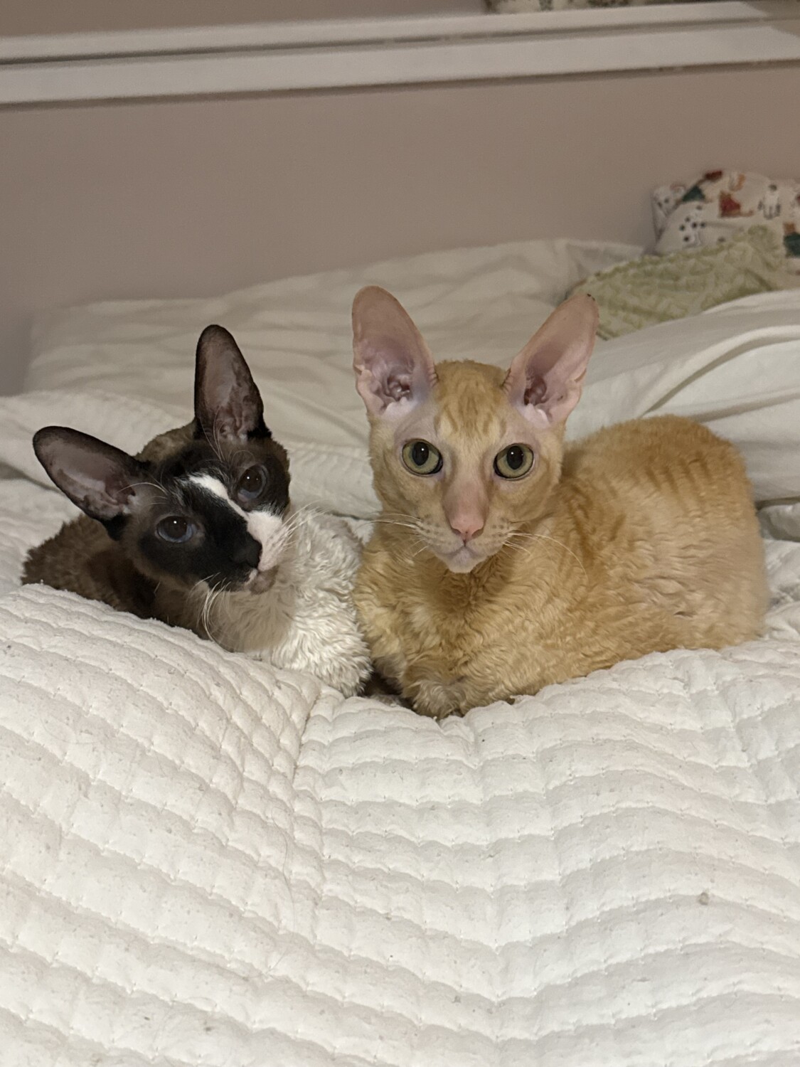 WREX and GARRUS are two very handsome 6 year old CORNISH REX’s. Both boys have are neutered, have all their claws, are FIV/FeLV negative, microchipped and fully vaccinated. Wrex is the larger of the two with big yellow/green eyes, a slender long body and a short orange curly coat. Garrus is a smaller boy with bog blue eyes and a velvety soft seal bi-color coat.