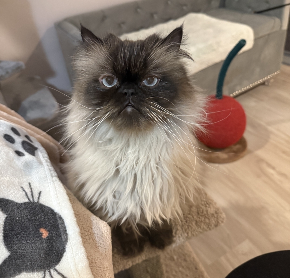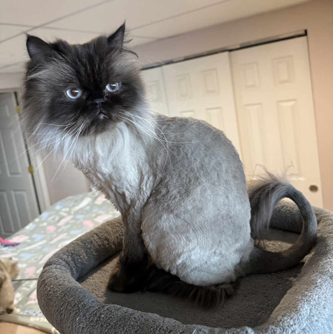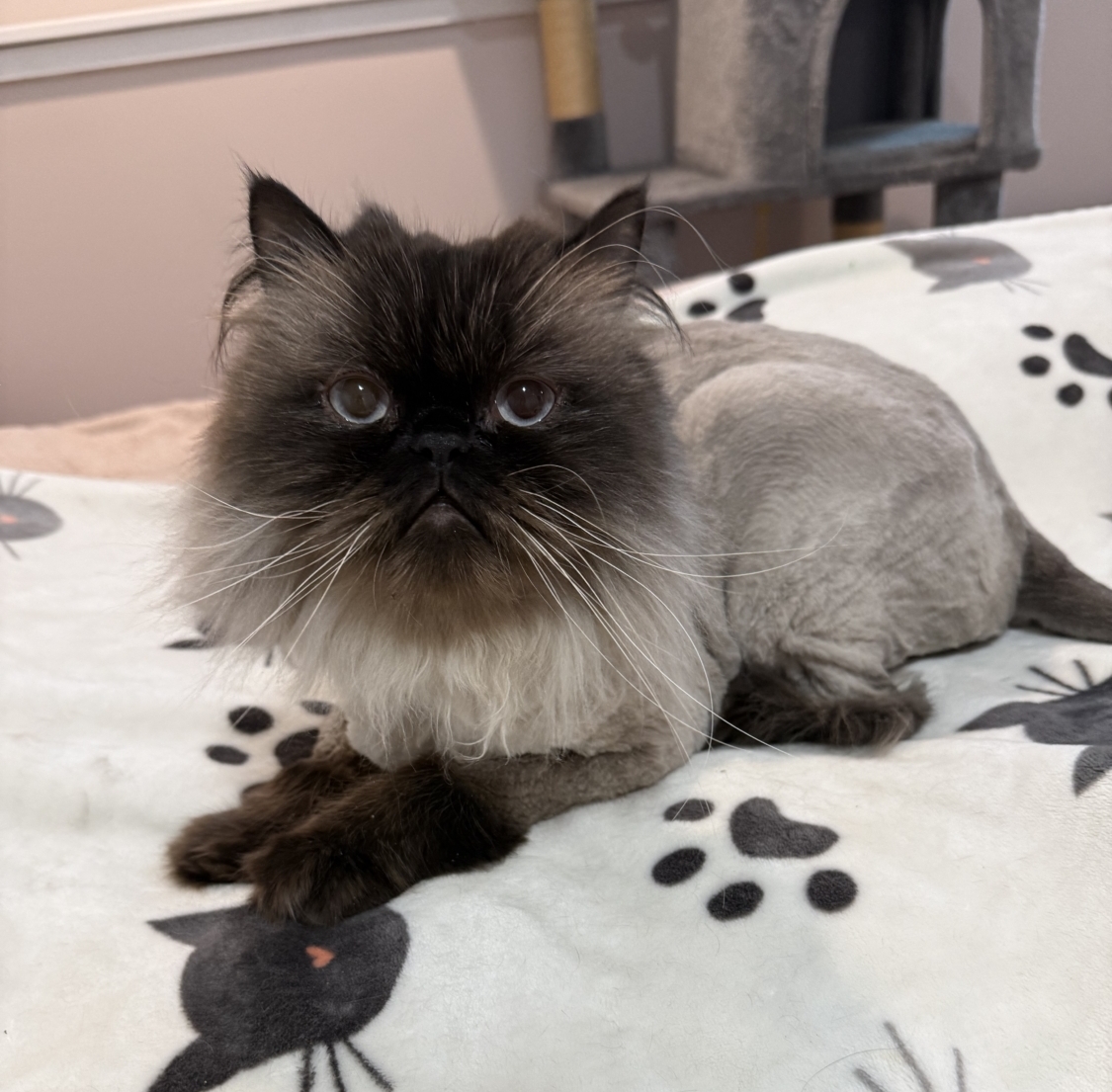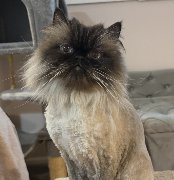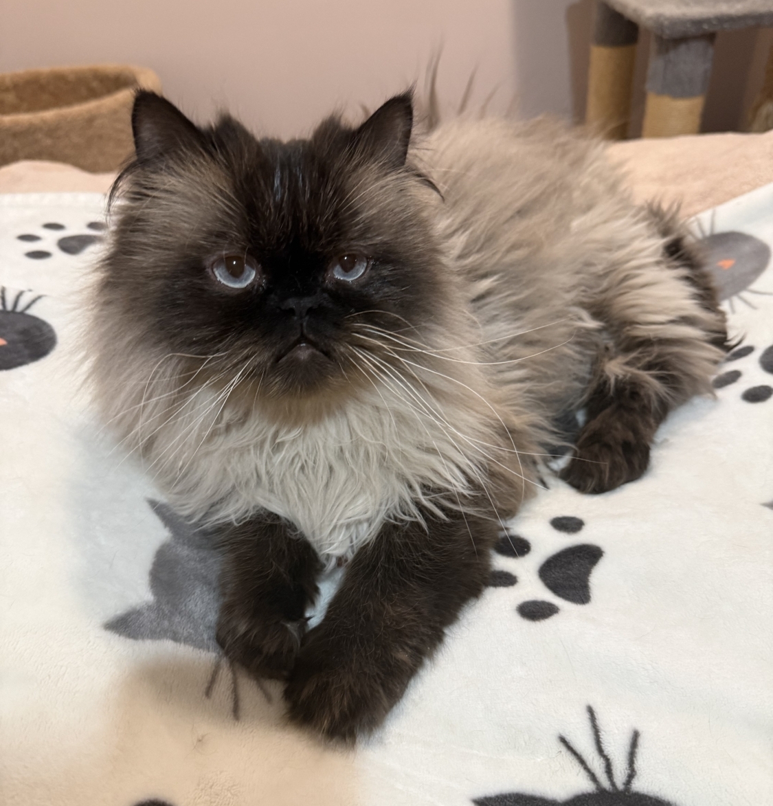 GEORGE is a handsome 3 year old SEAL POINT HIMALAYAN. George has all his claws, is neutered, microchipped, FIV/FeLV negative and fully vaccinated. George has a thick coat of hair and he is not a fan of being brushed so he is sporting a lovely lion cut. George has beautiful lite blue eyes which do require wiping and this he enjoys.