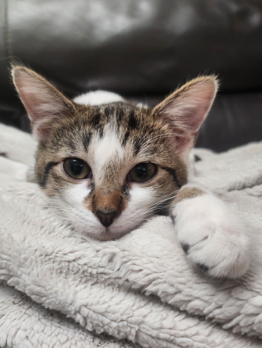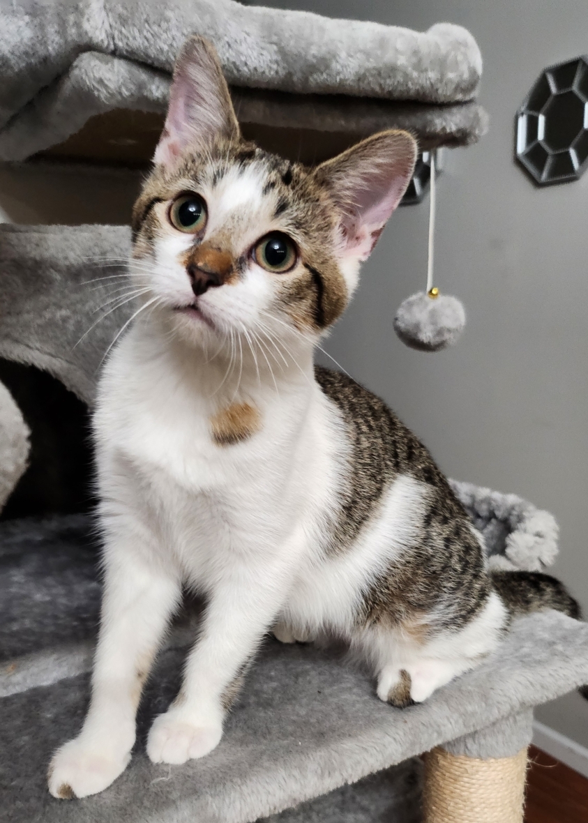 Gidget and her brother Spots (also available for adoption) were found as tiny kittens in a window-well of an abandoned home. When their mom never returned for them they were rescued by a follower of SPCR and they contacted us to see if we would take them. They both have thrived in foster care, but now are ready to find their forever families!