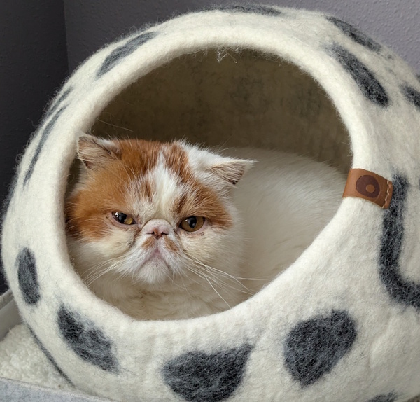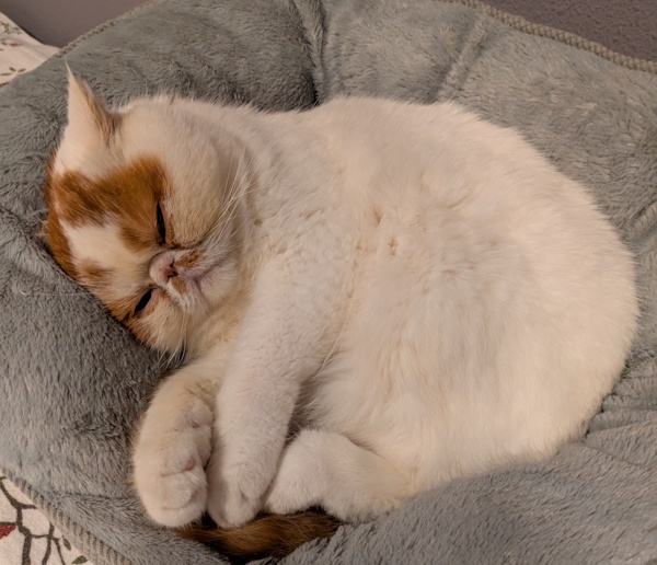 Gizmo has a pretty typical Exotic Shorthair personality. He is sweet, easy going, low energy and very well behaved. His foster mom has truly fallen in love with this precious little lamb. When she comes to check on him, she often finds him hanging out on the sofa. As soon as she approaches him, he starts to purr and then he rolls over on his side so his foster mom can rub his little belly. It is truly very therapeutic and makes his foster mom want to purr in unison with him – LOL.