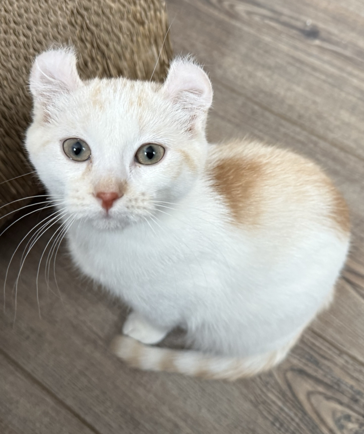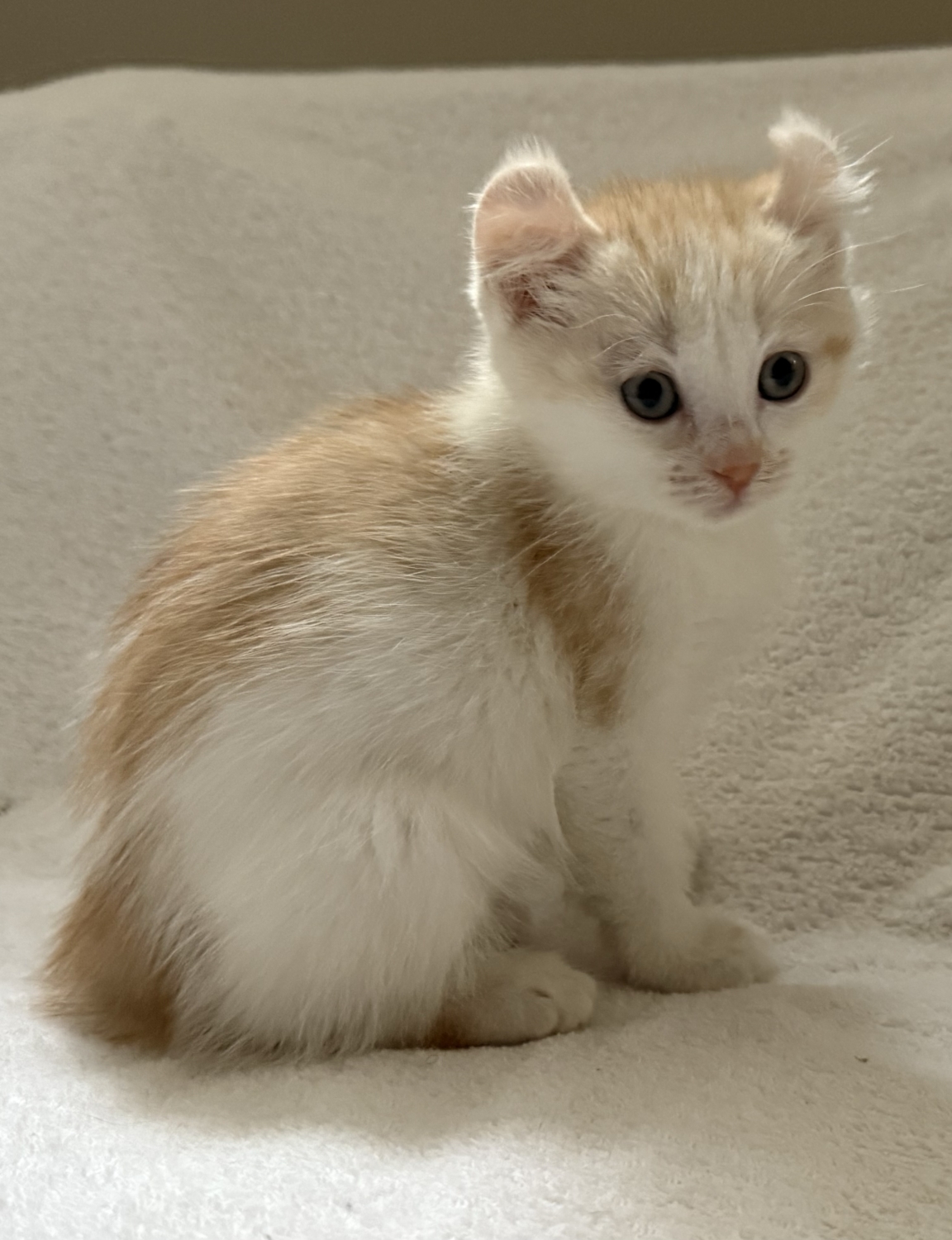 HARLOW is a CREAM and RED AMERICAN CURL. It is a newer breed developed in the early 80s, and the cats are still quite rare. She has short, sleek fur that is very easy to maintain and has light green eyes. Harlow is 4 months of age and weighs 4.2 lbs. She has been spayed, is fully vaccinated, tested negative for FIV/FeLV, has her claws and has been microchipped to ensure she can always be reunited with loved ones. The ears on this breed curl back, away from the face. It is a mutation that doesn’t negatively affect other cartilage in the body.