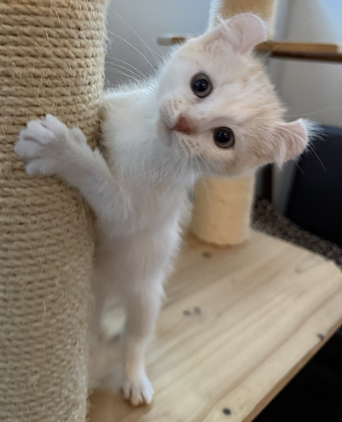 Of all the kittens in this foster home, Harlow is the biggest foodie among them. Her growth has outpaced her sisters due to her love of wet food. She will need her human caretaker to primarily feed dry food as it helps to keep her appetite and weight in check. Harlow enjoys playing with wand toys, crinkle balls, and toy mice. She thoroughly enjoys climbing up and sleeping on towers. She also likes to have access to a heated pet bed to warm up when a human lap isn’t available. Harlow primarily cries about wanting wet food at the time of day that it is normally provided. Otherwise, she isn’t noisy except to purr when you talk to her and pet her. She conforms to the American Curl breed which is known for being affectionate, playful and kitten-like throughout their lives.