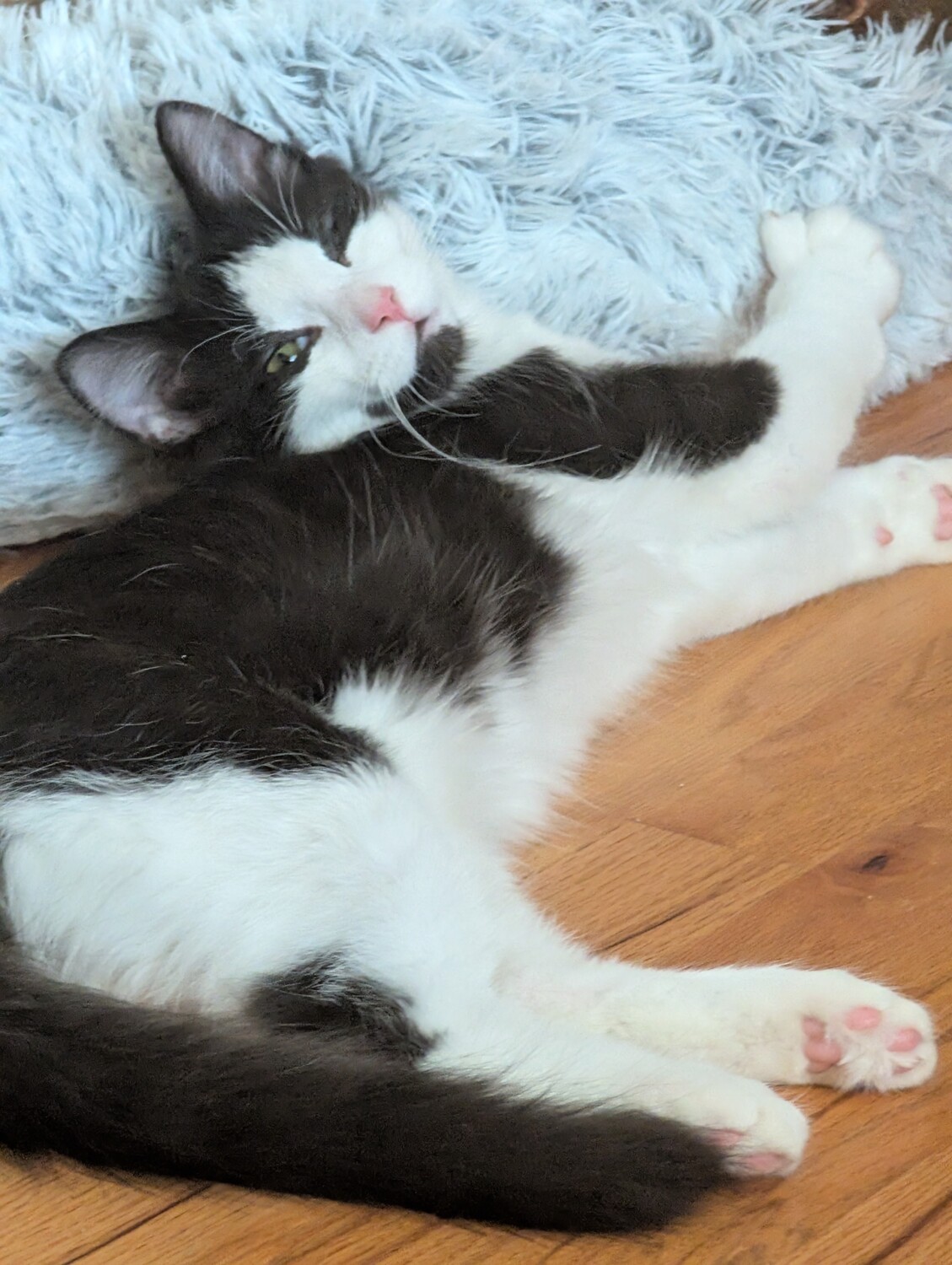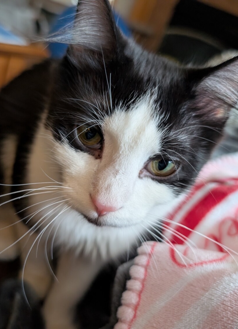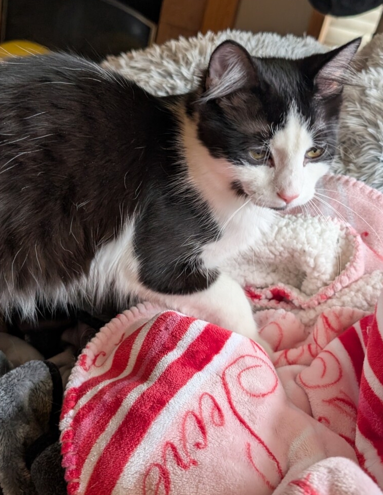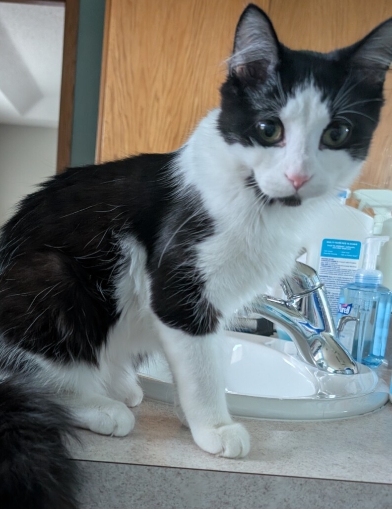JACK is a sweet DOMESTIC MEDIUM HAIR kitten. He is 8 months old. He is a black and white bicolor, has been neutered, and has large hazel/Green eyes. He has all of his claws and is just over 8 pounds. He has been fully vetted, is up to date on shots, dewormed, microchipped, and is FeLV/FIV negative, and is ready to go to his forever home.