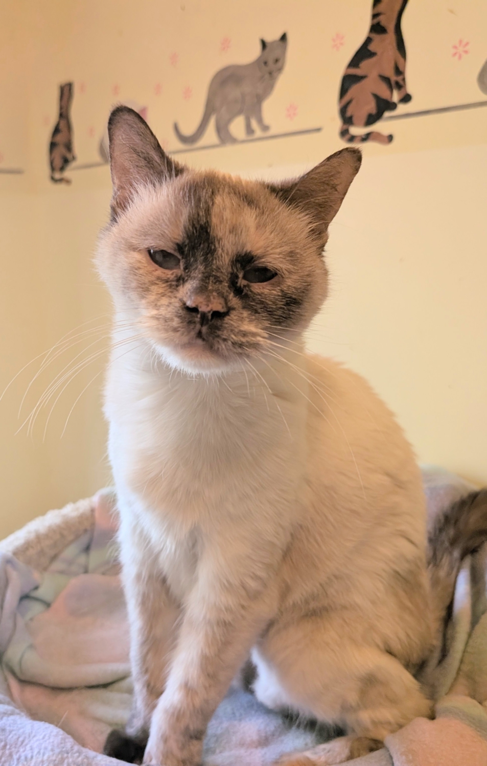 Katy was born with eyes that are a bit smaller than usual but she sees fine. Now and then one eye will get a little runny but a moist cotton ball takes care of it. They really don’t affect her in any other way. She is otherwise just PURRFECT!