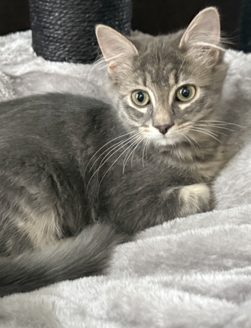 KENAI is a gorgeous, GRAY TABBY BALINESE MIX with medium length fur. His eyes are blue near the pupils and green to fill in the rest of the corneas. He is 4 months of age and weighs 3.6 lbs. He has been neutered, fully vaccinated, tested negative for FIV/FeLV, has his claws and has been microchipped to ensure he can always be reunited with loved ones.