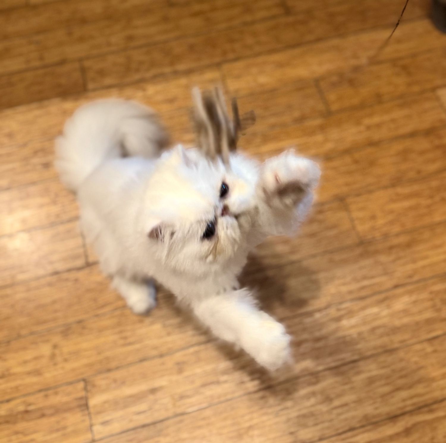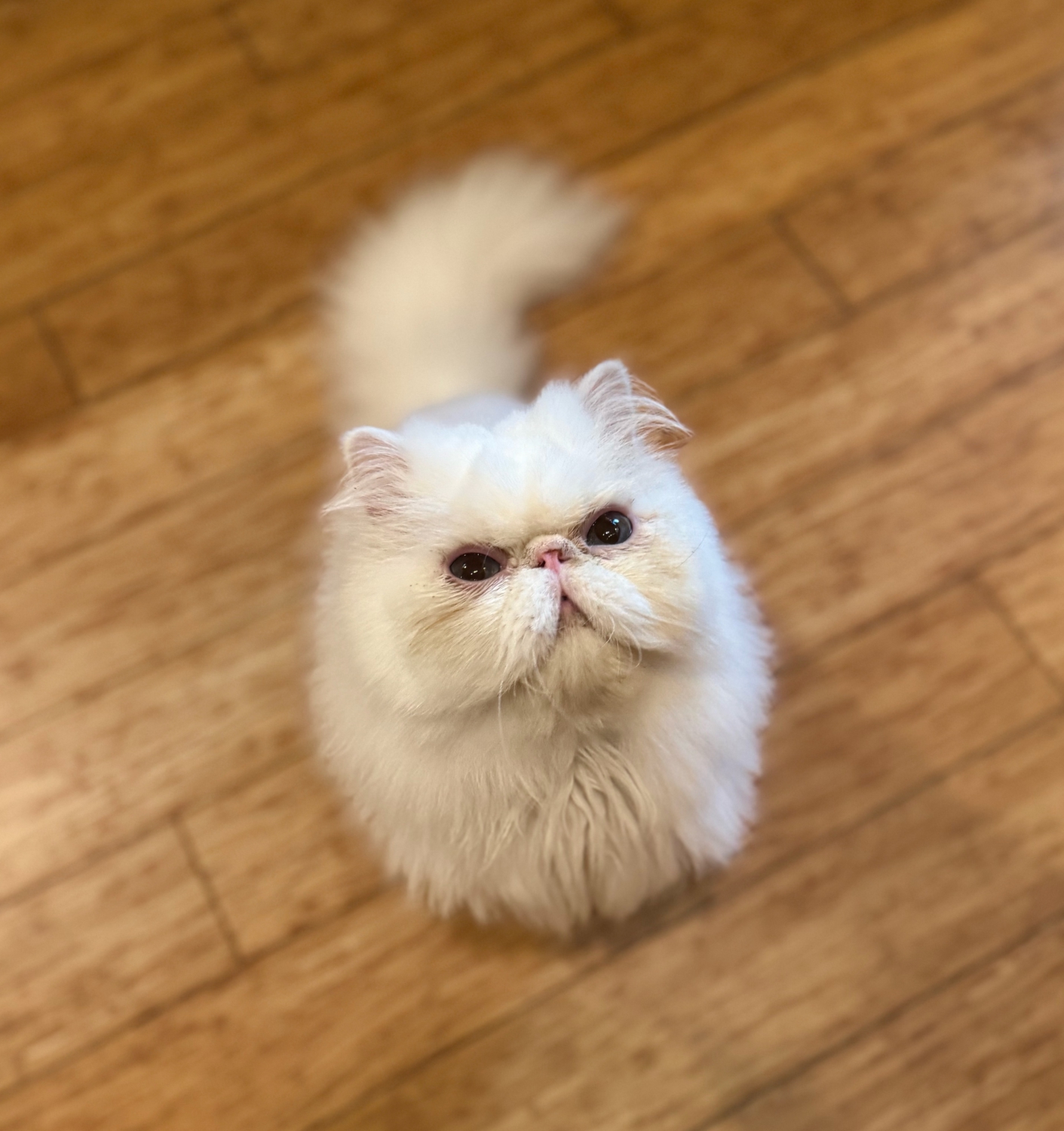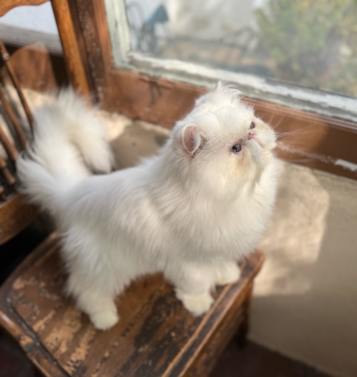 The best home for this sweetheart would be calm, quiet, adult and familiar with the upkeep of Persians, especially light colored Persians who need just a bit more around their faces to keep clean. Pie’s eyes do need to be wiped regularly, like most flat faced cats, and his face can get messy after meals. If you’ve had a Persian or Himalayan or Exotic Shorthair, you know that’s just the way they are! 🙂 However he does ENJOY the cleanup process so that makes things that much easier! He has a cottony coat that needs regular grooming or a lion cut to keep neat. He just had his teeth cleaned and is very healthy and ready to go!