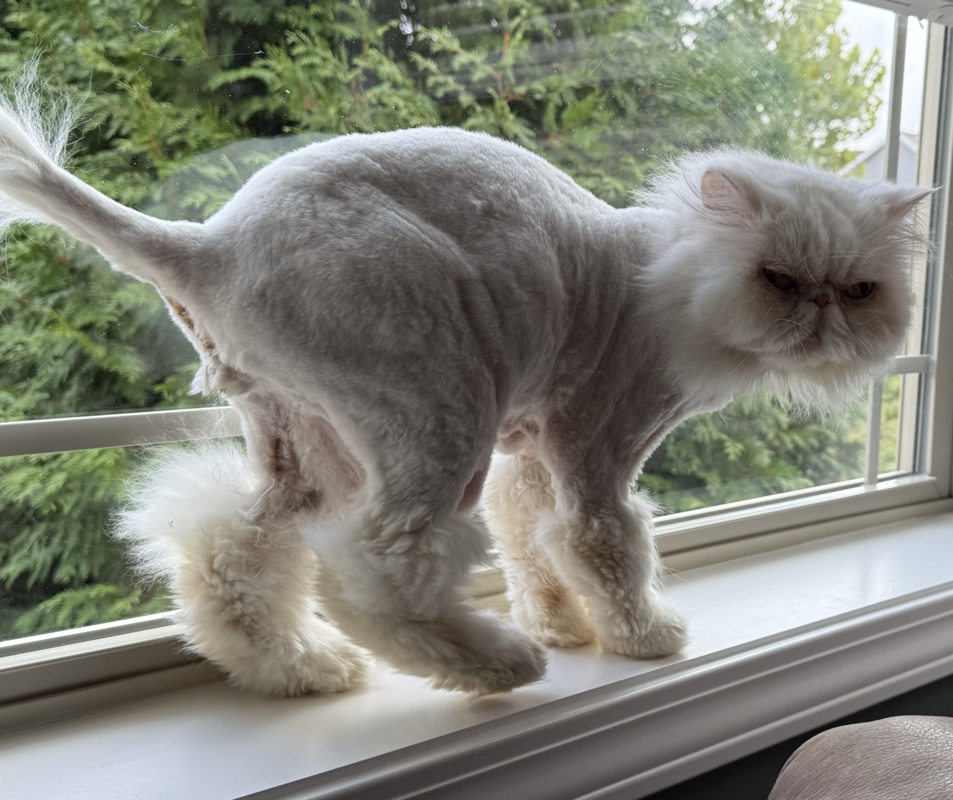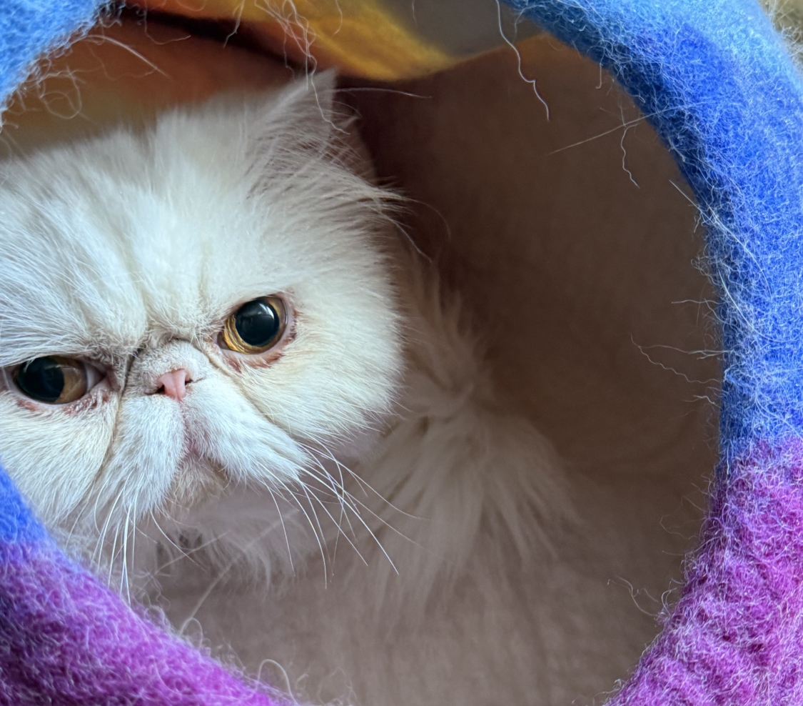 Like most Persians, his eyes are weepy and require daily wiping which he doesn’t mind. He also doesn’t mind getting combed and getting his toenails trimmed. He is just a sweet boy.