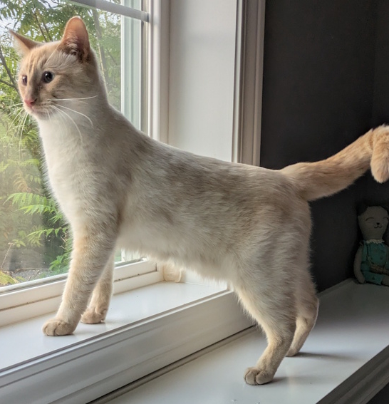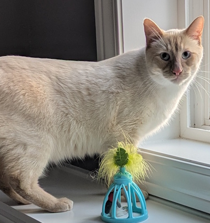 Snowball sometimes bats some toys around on his own, and he enjoys it when his foster mom swishes Da Bird or the mink wand toy around for him to catch. Other than that, he is a chill, non-intrusive boy.