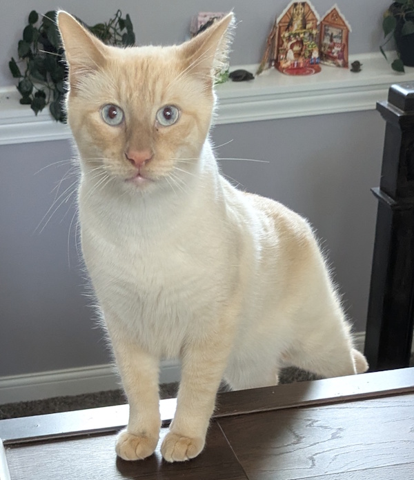 SNOWBALL is a FLAME POINT SIAMESE with light blue eyes. He is 1 year old, has his claws, is neutered, up to date on vaccinations, FeLV/FIV negative, and microchipped. This strapping boy weighs a little over 11 lbs.