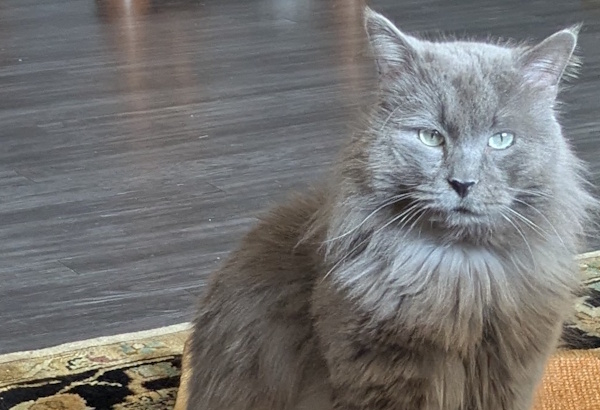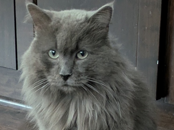 SNUGGLES is a precious GRAY DOMESTIC LONGHAIR with blue eyes. He is about 7 years old, neutered, has his claws, is up to date on vaccinations, tested negative for FeLV/FIV, and microchipped. He weighs around 10 lbs.