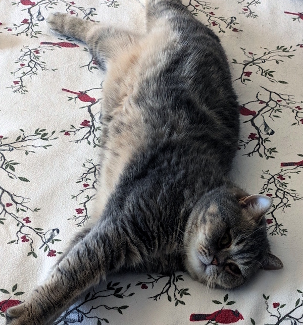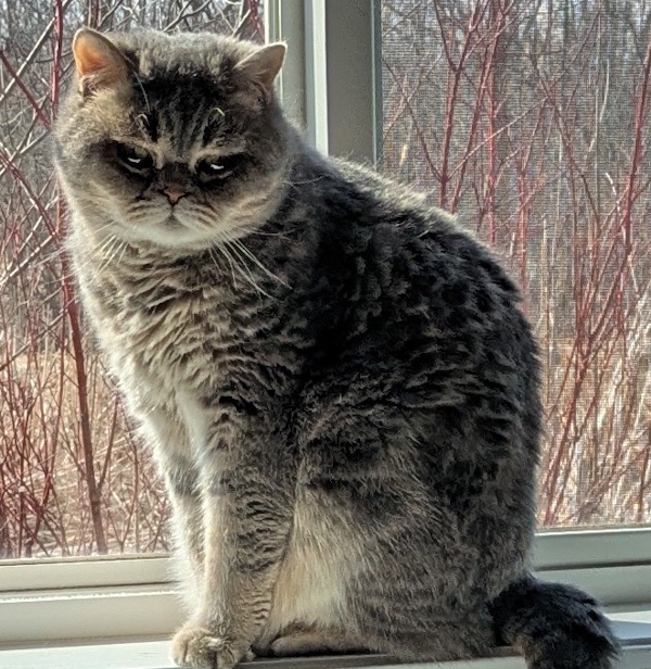 For the most part, Teddy seems to be a low-energy chap who is content sitting on the cat tree or hanging out on the couch, but he does enjoy a couple of play sessions with his foster mom when she swirls around a mink wand toy (which will be sent home with him). He also enjoys batting around spring toys, and occasionally he will wrestle with a catnip toy. When his foster mom is in close vicinity, Teddy likes to be close by, though not on her lap. If he ever will become a lap cat is anyone’s guess, but we were told that he did like to sleep at the foot of his previous owner’s bed.
