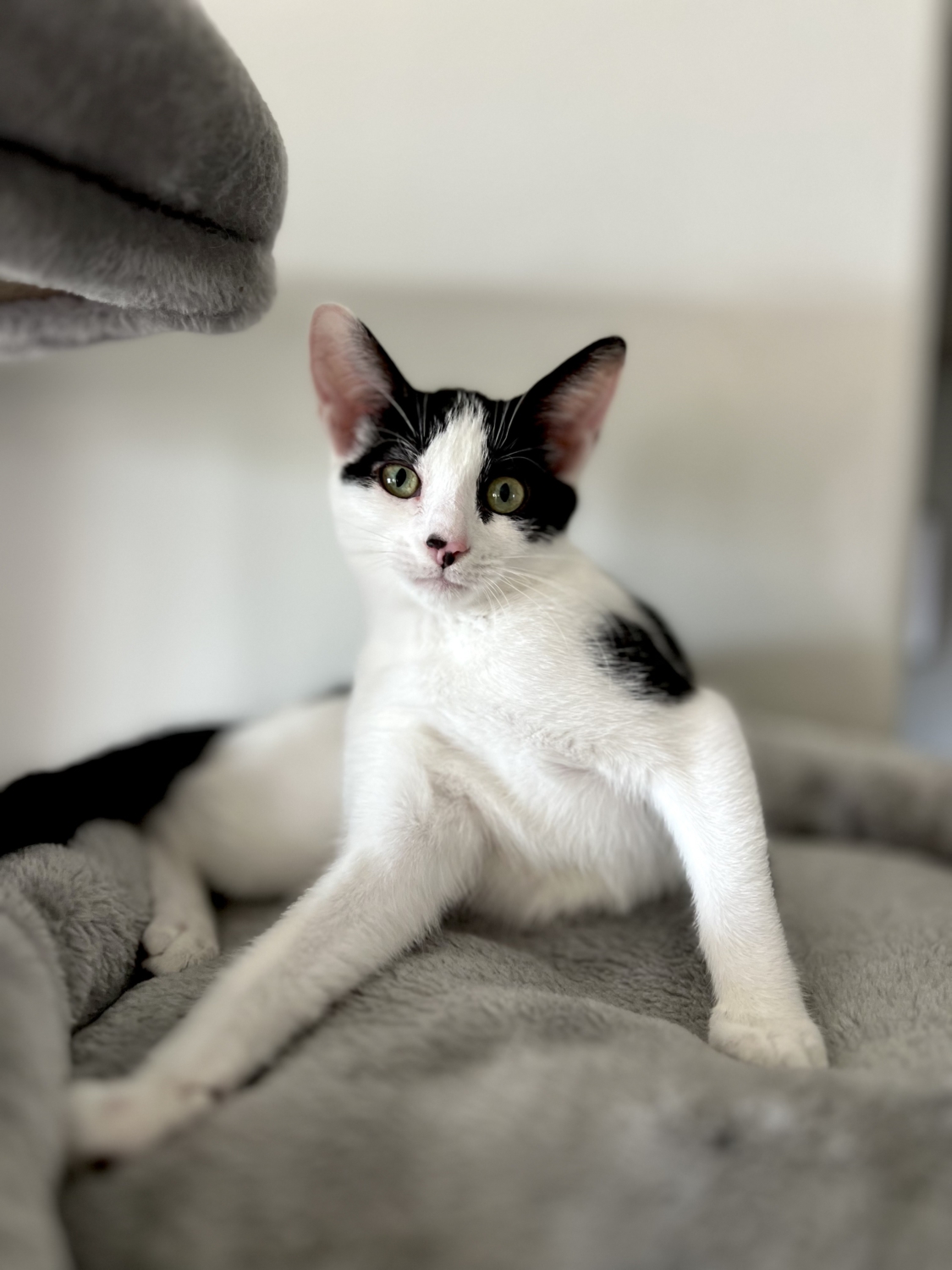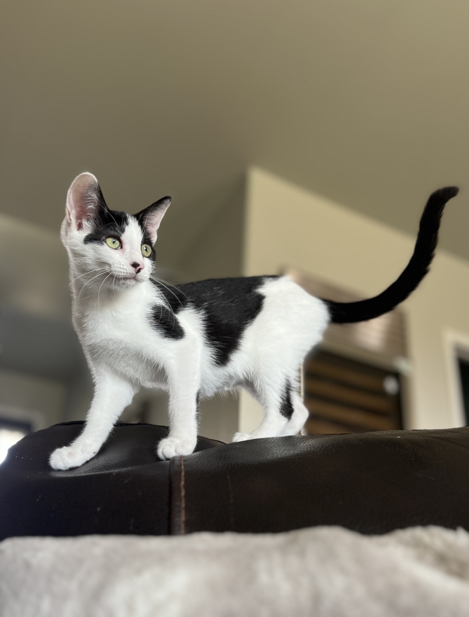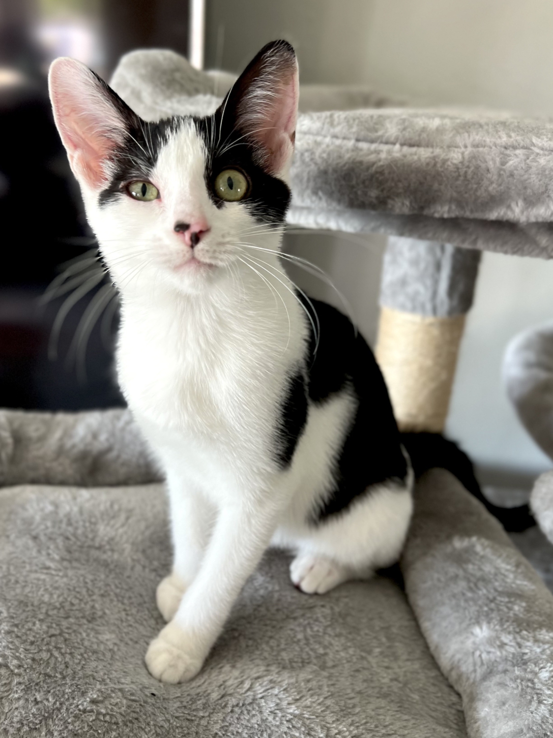 TESSA is a friendly and social 4 month old BLACK AND WHITE DOMESTIC SHORTHAIR kitten. She is spayed, current on age-appropriate vaccinations, FIV/FeLV negative, microchipped and has her claws.