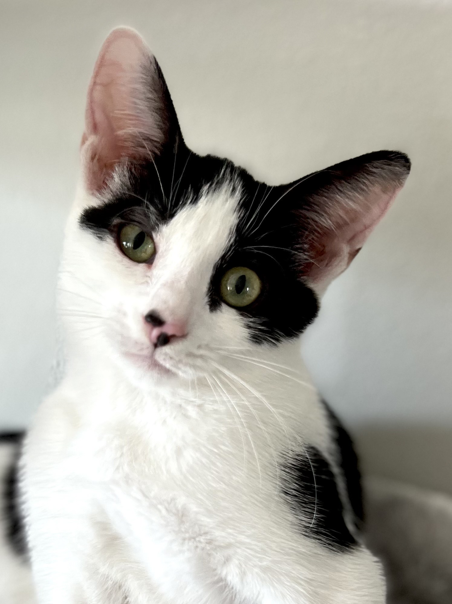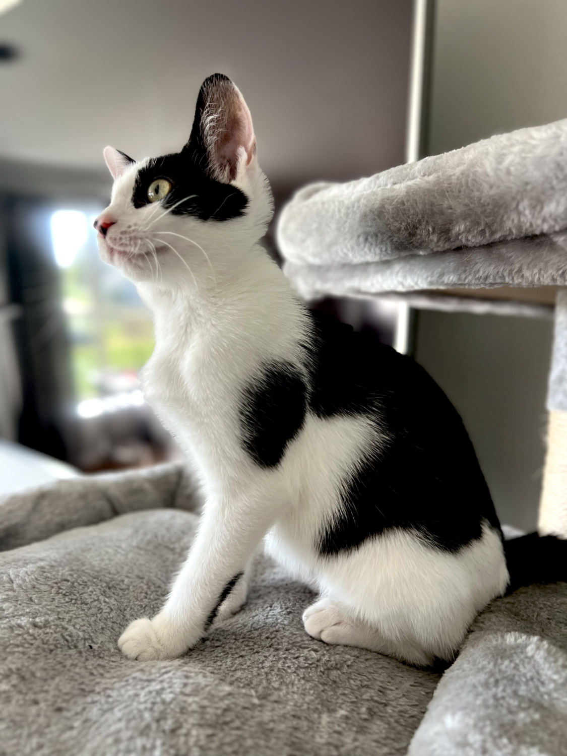 Tessa has very unique markings and two cute black dots on her nose. She has big ears that she will eventually grow in to, but the vet thinks that she is going to be a long, lean cat when she grows up! Tessa will start out shy around new people, but once comfortable she is a loving kitten.