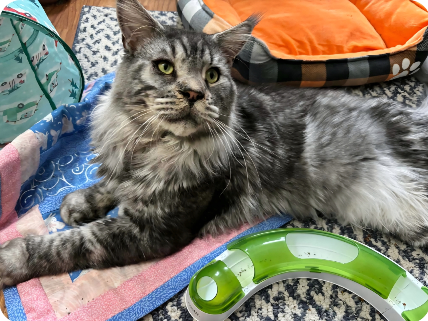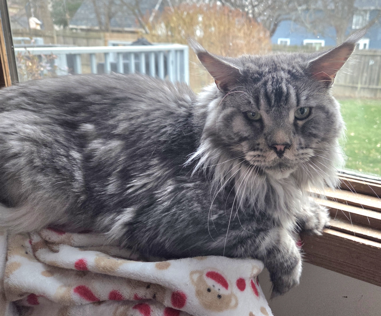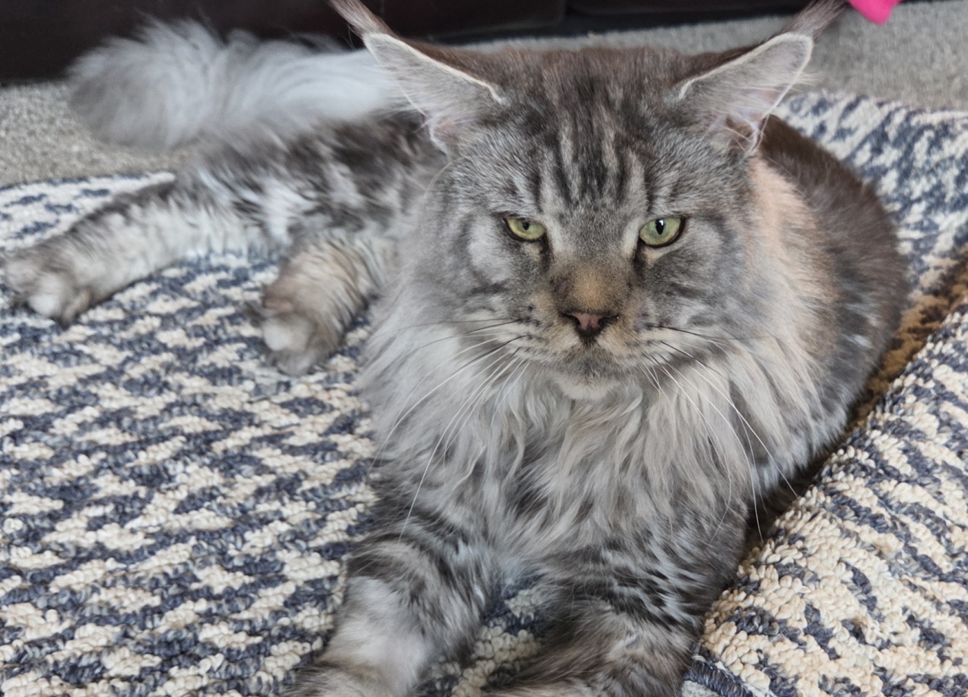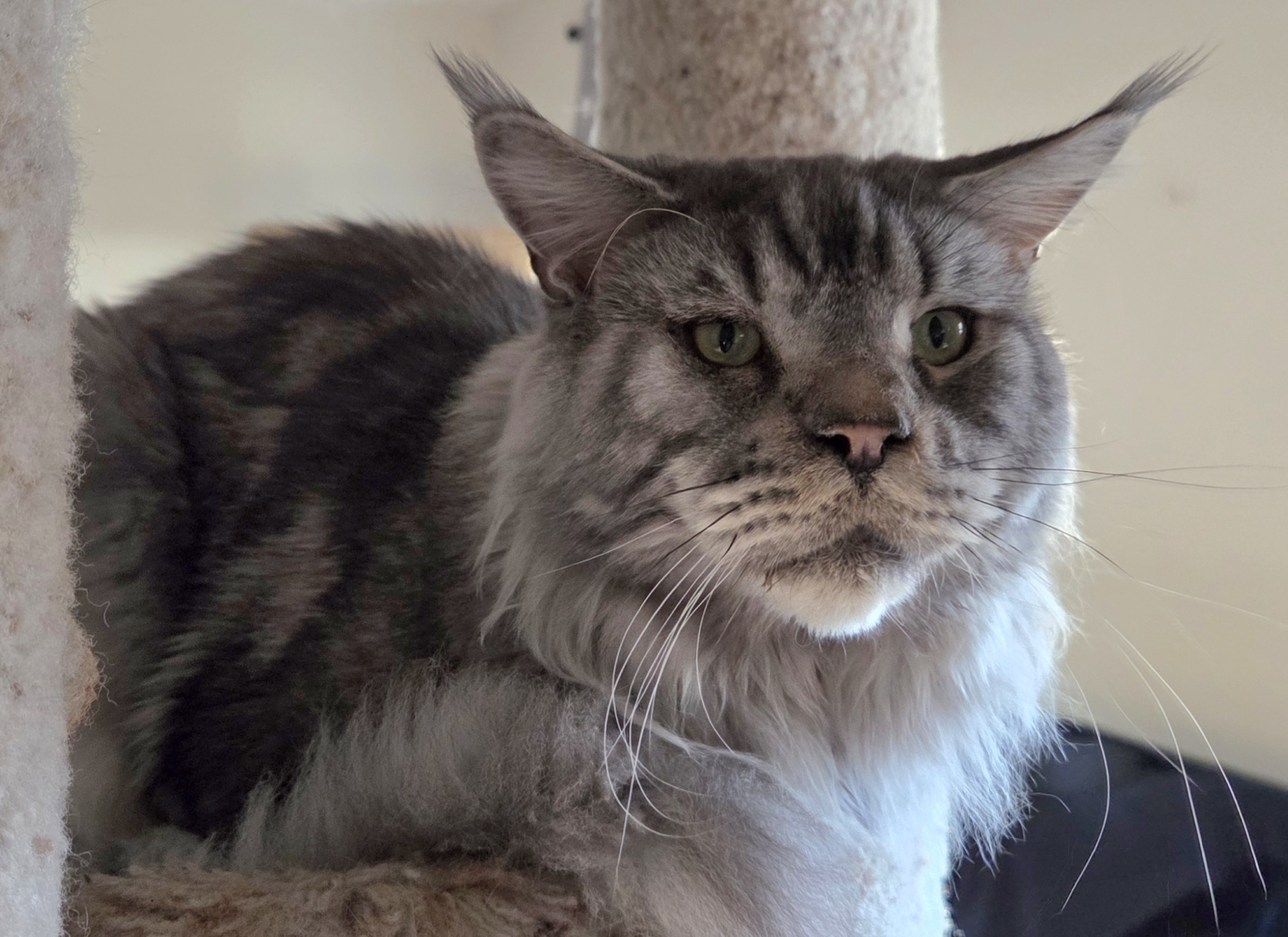 TIDUS is a 3 year old male SILVER SHADED MAINE COON. He is 18lbs. Fully vetted including neutered, rabies and distemper vaccine, microchipped, feluk and fiv negative.