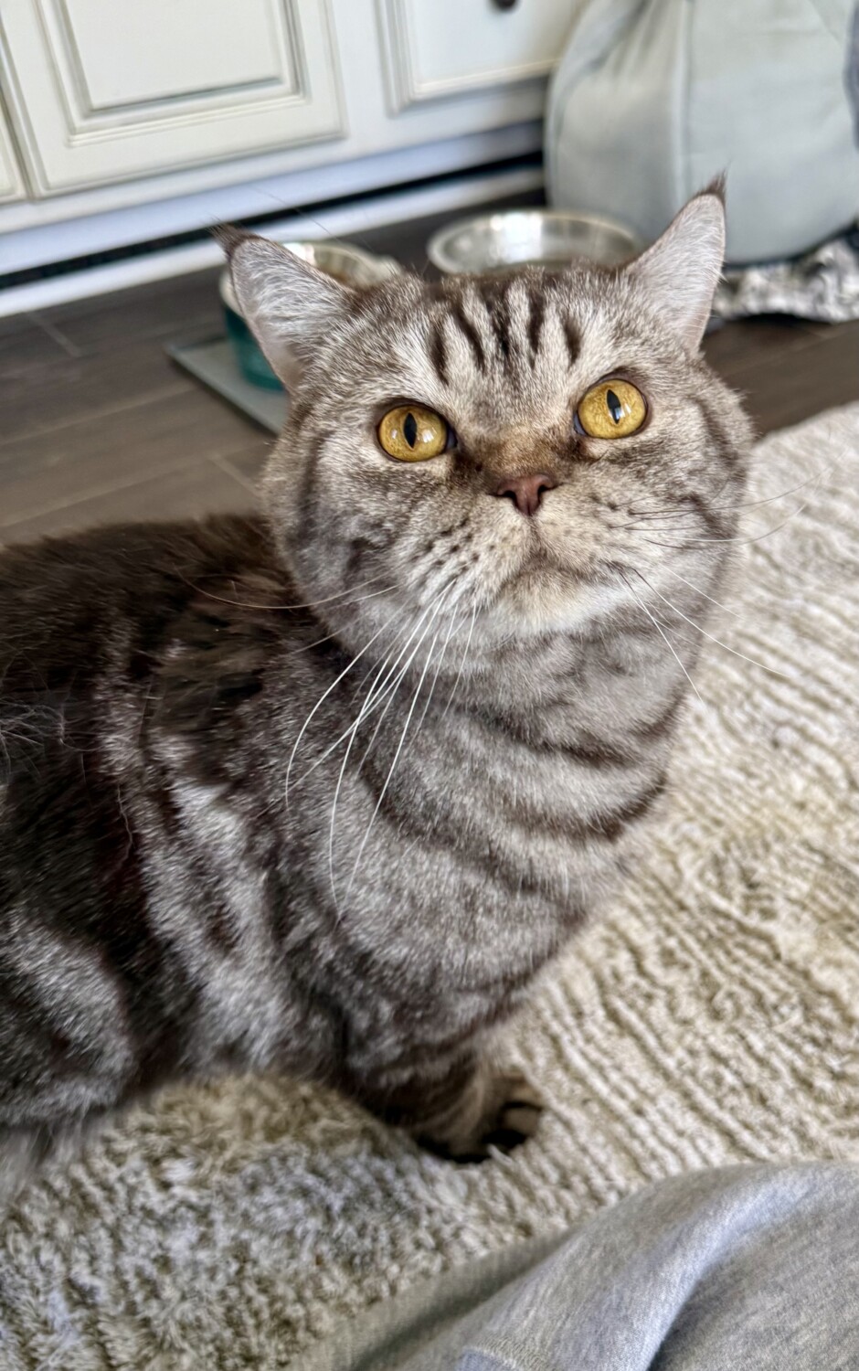 He is quite the gentleman and does fine with being picked up and brushed. Due to his flatter face, he will need his eyes wiped on occasion. He is a very docile, relaxed guy. He is happy sitting in a cat tree looking out the window or in a cat cave. He is independent, but also very affectionate and will let you know when he wants attention. He is a very nice boy.